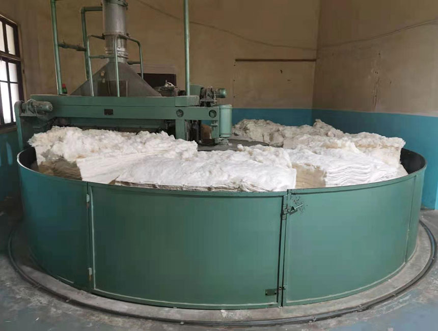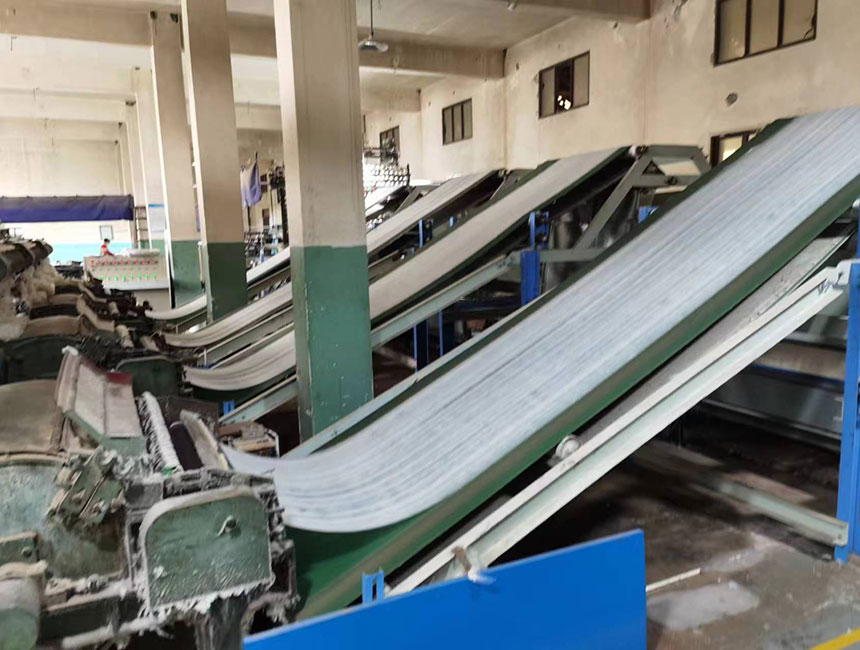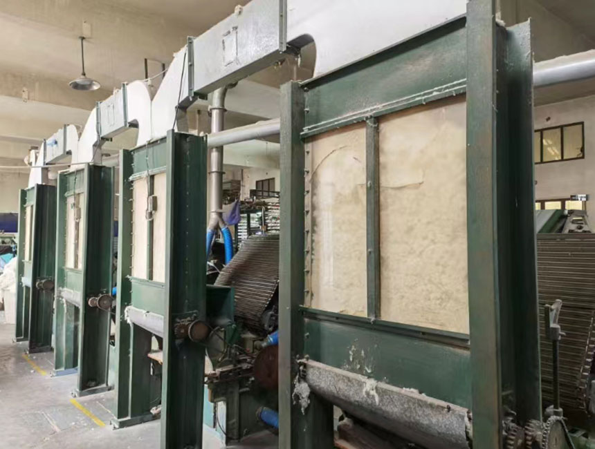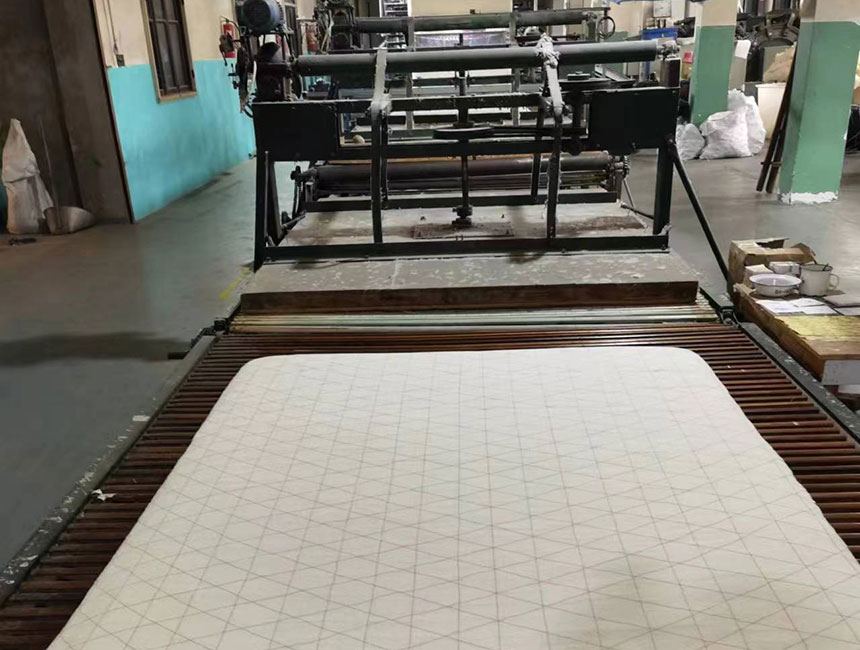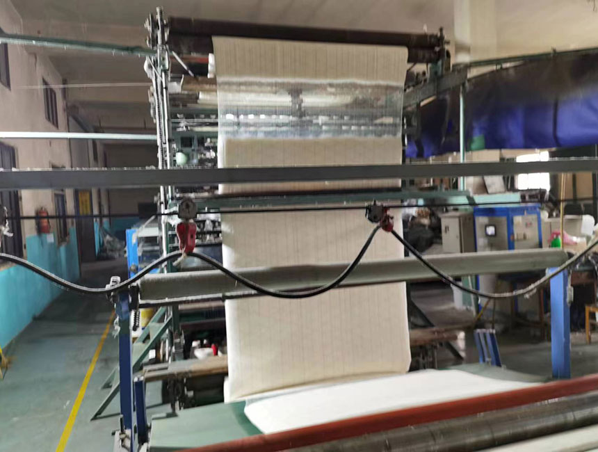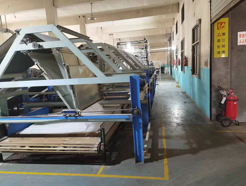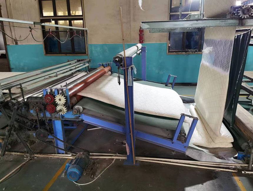 我公司棉胎制造設(shè)備繞紗機、棉層穩(wěn)定氣壓棉箱、抓棉機加濕裝置、梳棉機清理棉屑、振動給棉機、切割斷棉機、防止棉花卷入切割刀轉(zhuǎn)抽、棉被固定裝置己獲發(fā)明專利一項、實用新型專利七項,是省內(nèi)獨一無二。從抓棉、清花、送棉、棉箱、梳棉,棉網(wǎng)、橫簾、繞紗、電刀、雙面研磨一系列程序有電腦自動控制,日產(chǎn)棉胎800條,整條自動生產(chǎn)線只用2名工人。
